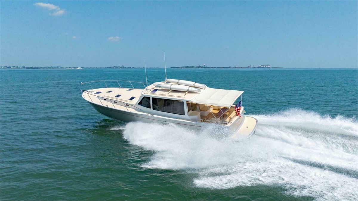 LOLA is a one-owner 2018 MJM 50z with low hours, designed by Doug Zurn and built by Boston Boat Works. Powered by triple Volvo IPS 600s, she cruises whisper-quiet at 35 knots, tops out at 40, and is equipped with Seakeeper gyro, Humphree tabs, and Raymarine electronics. Her bright interior features a forward stateroom, a convertible guest cabin, dual heads with enclosed showers, and custom touches, including Bimini-integrated sunshades and kayak racks. Immaculately maintained, she shows like new and is turnkey for her next adventure.
