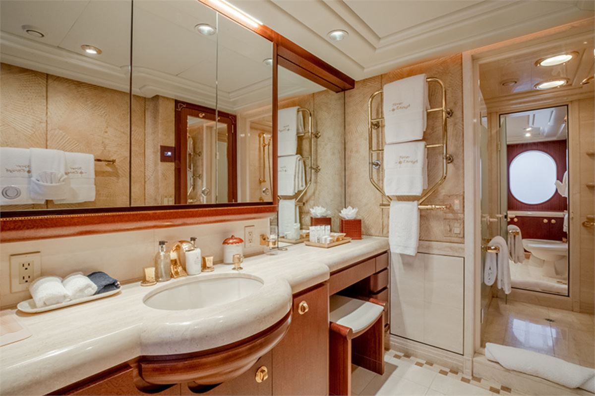 A full-beam Owner's stateroom with king berth has his and hers ensuite on the main deck